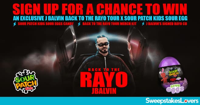 Twenty-five (25) Grand Prizes: One (1) J Balvin Back to the Rayo Tour x SOUR PATCH KIDS Sour Egg. ARV: $81.00 each. Total ARV of all available prizes is $2,025.00.